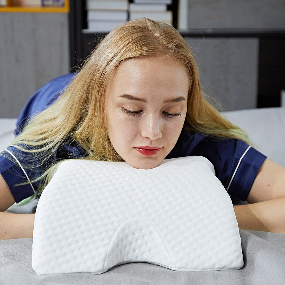 - Il peut diminuer les douleurs des cervicales et du dos grâce au ré-alignement de la colonne vertébrale qu’il effectue durant le sommeil ! De plus, vos coudes reprendront une position naturelle car vos bras ne seront plus gênés de se positionner comme ils le souhaitent. Même votre visage en profitera, car il ne sera plus posé directement sur le matelas mais délicatement soutenu